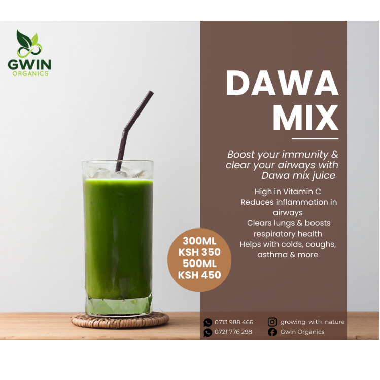 Power up your immunity and breathe easy with our all-natural Dawa Mix Juice. Packed with Vitamin C and anti-inflammatory properties, it’s your go-to for respiratory health and overall well-being.