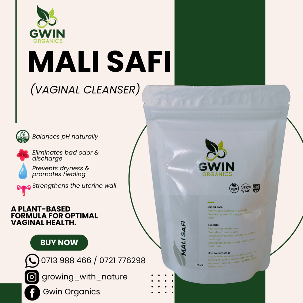 Mali Safi is a 100% plant-based formulation designed to support optimal vaginal health by naturally cleansing, balancing pH levels, and promoting healing.